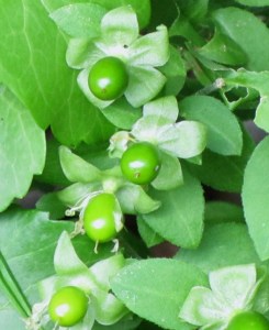 ※8月20日の観察会で見られたもの 天候:くもり後雨 植物:シラカンバ(実)、オオバボダイジュ(実)、エゾニワトコ(実)、オオカメノキ(実)、ミヤマガマズミ(実)、ガガイモ(実)、ナンバンハコベ(実)、タニタデ、イヌタデ、ミヤマセンキュウ、サワシバ(実)、ヒメフウロ、ゲンノショウコ、シナガワハギ、ツユクサ、カタバミ、イヌホオズキ、ドクダミ、キツリフネ、ウド、オオイタドリ、セイヨウノコギリソウ、トクサ、ツタウルシ、ヤマウルシ、ツノハシバミ、エビガライチゴ(実)、ハクウンボク(実) など 野鳥:ヒヨドリ、カワガラス その他:キマワリ、クジャクチョウ、ヤママユ幼虫、ヤゴ、サッポロマイマイ など ナンバンハコベ |