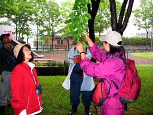 | 6月17日当日は、あいにくの雨!「誰も来なかったらどうしよう〜」と心配していたのですが、雨天にもかかわらず参加者10名と幸先の良いスタートです。まずは、すぐ近くの豊川3丁目公園で樹木ウォッチングこの小さな公園にはどれくらいの木々があるかな? | |