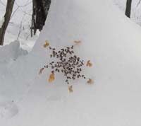 ○見られたもの:「植物」シナノキ、ドイツトウヒ、トドマツ、エゾマツ、アカエゾマツ、ヤドリギ、ノリウツギ、イワガラミ、ツルアジサイ、ミズキ、コクワ、ツルウメモドキ、シラカンバ、ケヤマハンノキなど 「野鳥」ヒヨドリ、アカゲラ、コゲラ、シジュウカラ、ヤマガラ、ハシブトガラ、ヒガラ、ゴジュウカラ、エナガ、ウソ など 「その他」 エゾリス足跡、テン足跡、キツネ足跡など |