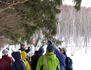 ○見られたもの:「植物」 シンジュ、ハルニレ、キタコブシ、カラハナソウ、ポプラ、ブナ、シダレカツラ、アカナラ、ハンノキ、ルブルムカエデ、トドマツ など 「野鳥」 シジュウカラ、ハシブトガラ、スズメ、ハシブトガラス、ハシボソガラス 「その他」キツネ足跡、ネズミ足跡、イラガ繭 |