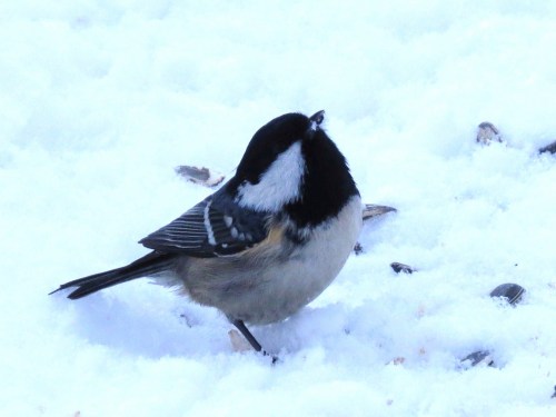 ○見られたもの:「野鳥」コゲラ、ヒヨドリ、ツグミ、ハシブトガラ、シジュウカラ、ヒガラ、ヤマガラ、ゴジュウカラ、マヒワ、ハシブトガラス、ヤマゲラの声 「植物」オニグルミの冬芽、アサダ、プラタナス、スギ、カツラ など 「その他」キツネ足跡、エゾリス足跡 ヒガラ |