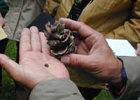 | 第4回目 豊平公園 2002年1月15日(火)10:00〜12:00 ○天候:晴 ○参加者:15名 ○講 師:自然ウオッチングセンター 島田、村野 ○研修生:鎌田、深田、住田 見られたもの:「植物」 ドイツトウヒ、トドマツ、アカエゾマツ、リキダマツ、シラカンバ、ニワウルシ、ヒヨクヒバ、キササゲなど 「野鳥」ハイタカ、ヒヨドリ、アカゲラ、ツグミ、シジュウカラ、ヤマガラ、ゴジュウカラ、マヒワ、カケス、ハシブトガラスなど 新年明けましておめでとうございます。今年も自然散歩を宜しくお願いします。 今年初のさっぽろ自然散歩は、「豊平公園」。 集合場所のすぐ近くに大きなマツボックリをいっぱいつけた大きなマツの木が立っていました。ここからウォッチング!樹高の高い「ドイツトウヒ」。いったい何メートルあるのでしょう?マツボックリも、特大です。→ ![]() |