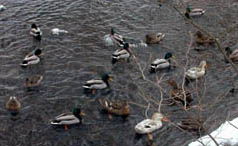 公園入口で、公園の看板地図を見ながら説明をしていると・・・。 エゾリスがお出迎えしてくれました。とってもかわいい姿を、近くでみせてくれました。雪から何か掘り出して食べたり、餌台のリンゴを食べたりしてましたよ。 おなじみのマガモとアイガモです。→ ![]() 混血の話やカモの仲間はどうやって自分の種類を見分けるのか?などなど近くでじっくり見れるからいろんな話が飛び出します。 ←木の上でバラバラになってしまうので、なかなか見られないトドマツのマツボックリ!半分だけ残って落ちてました。 |