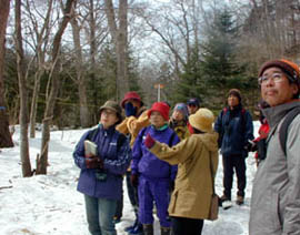 | 第4回目 円山公園 2004年1月19日(月) 10:00〜12:00 ○天候:曇 ○参加者:11名 ○講 師:自然ウオッチングセンター 島田、村野 ○研修生:鎌田 ○見られたもの:「植物」ナナカマド、ヤドリギ、スギ、キササゲ、ヤマモミジ、サワラ、ニワウルシ、バンクスマツなど 「野鳥」ハシブトガラ、ゴジュウカラ、ウソ、コゲラ、シジュウカラ、ヤマガラ、アカゲラ、シメ、スズメなど 「その他」エゾリスの巣材をとった痕、エゾリスの足跡 など |