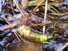 上流の湿原は水の流れがあるところから雪がなくなっていました。木道も新しくなっていて歩きやすい! ミズバショウの芽が大きくなって、ドクゼリの浮く根っこが良く目立ちました。 (2006年3月28日 さっぽろ自然散歩 西岡公園より) 講師:島田明英、村野道子 レポート:鎌田恵実 |