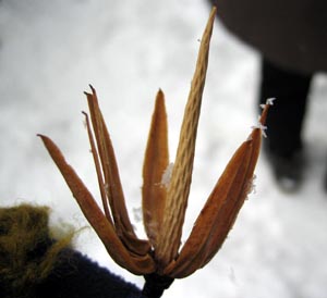 ○見られたもの:「植物」など 「野鳥」 ヒヨドリ、アカゲラ、コゲラ、シジュウカラ、ヒガラ、ゴジュウカラ、ハシブトガラ、カワラヒワ、マヒワ、カケスなど 「その他」 スズメバチの巣、エゾリスの巣、クマゲラ食痕、シジュウカラの巣、エゾリスの足跡など |