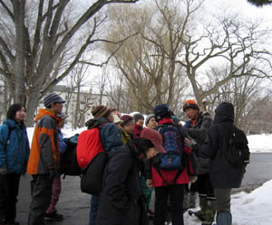 | 冬 第6回目 北大構内 2007年3月20日(火) 10:00〜12:00 ○天候:曇 ○参加者:25名 ○講 師:島田、村野 研修生:鎌田 |