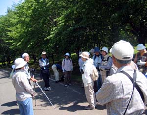 | 第1回目 北大構内 2008年4月28日(月) 10:00〜12:00 ○天候:曇 ○参加者:27名 ○講 師:島田、村野 研修生:鎌田、中嶋 |