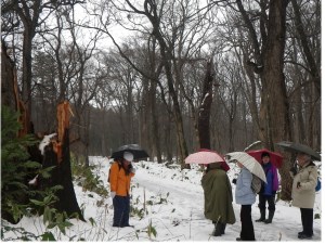 | 第3回目 野幌森林公園大沢口 2012年12月4日(火)10:00〜11:40 ○天候:大雨、雷 ○参加者:5名 ○講 師:島田、村野、鎌田 |
