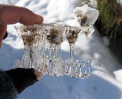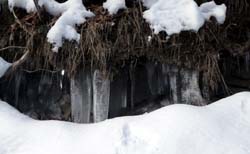 ※3月14日の観察会で見られたもの 天候:晴 春をさがすつもりが、夜に雪が降りすっかり雪景色に逆戻りです。 植物:シラカンバ花芽、ハンノキ花芽、タラノキ、ハリギリ、イタヤカエデ樹液、ホオノキ実、ヤドリギ、エゾニワトコ冬芽、コブニレ、メタセコイヤ など 野鳥:マガモ、カワガラス、ヤマセミ、ヒヨドリ、ハシブトガラ、ヤマガラ、ゴジュウカラ、シマエナガ など その他:キツネ足跡、ツララ、エゾリスの巣、カラスの巣 など |