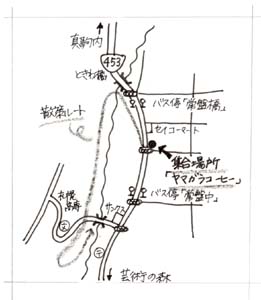 2008年5月よりスタートした新企画自然散歩です。喫茶店「自家焙煎 ヤマガラ珈琲」に集合!雑木林や川沿いの道を、自然を観察しながら散歩します。
